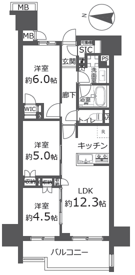 LDK約12.3畳 洋室約6.0畳 洋室約5.0畳 洋室約4.5畳 |