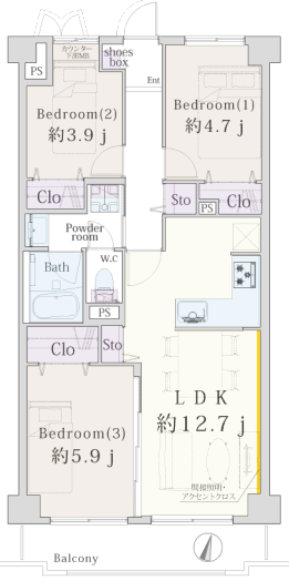 LDK約12.7畳 洋室約4.7畳 洋室約3.9畳 洋室約5.9畳 |