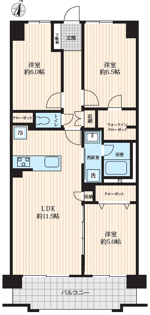 洋室約6.0畳 洋室約6.5畳 洋室約5.6畳 LDK約11.5畳 +WIC |