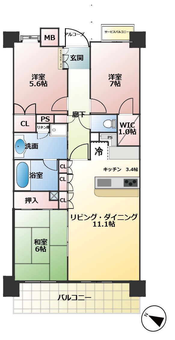 LD11.1畳 K3.4畳 和室6畳 洋室5.6畳 洋室7畳 +WIC |