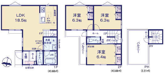 間取内容 LDK18.5畳   洋室6.3畳   洋室6.3畳   洋室6.4畳
