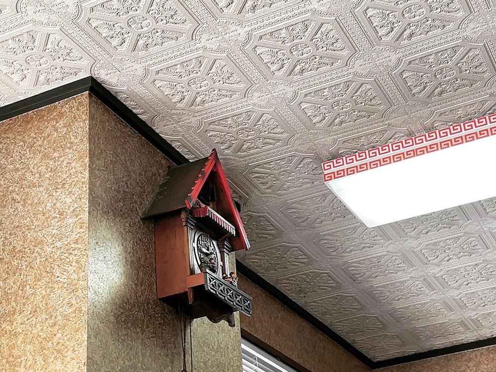 天井の壁紙もステキですが、最近ではあまり見かけなくなった鳩時計が良い味を出しています。