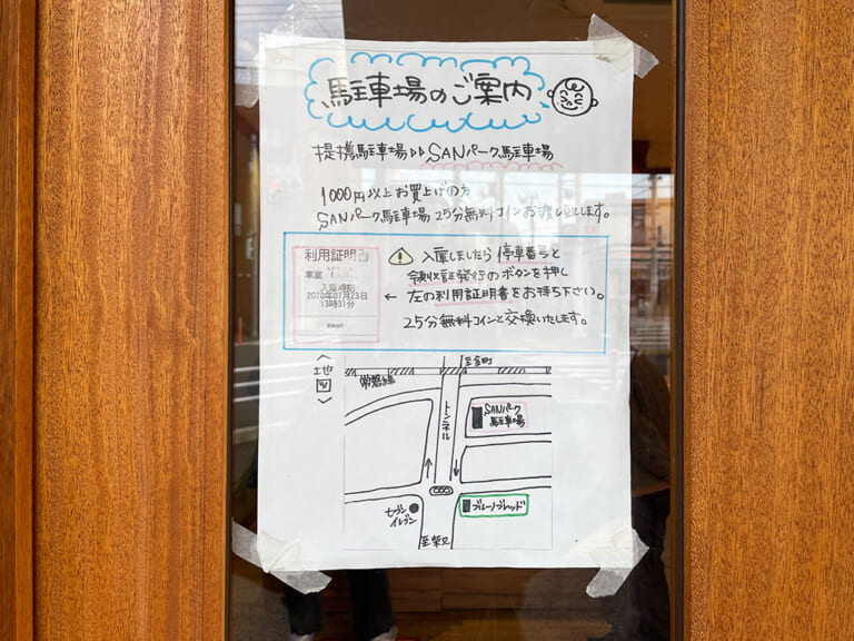 お店の前の道路はとても車通りが多く、且つバス停もあるのでなかなか車を止めるのがむずかしい道路ですが、近くに連携駐車場があるのでご心配なく。