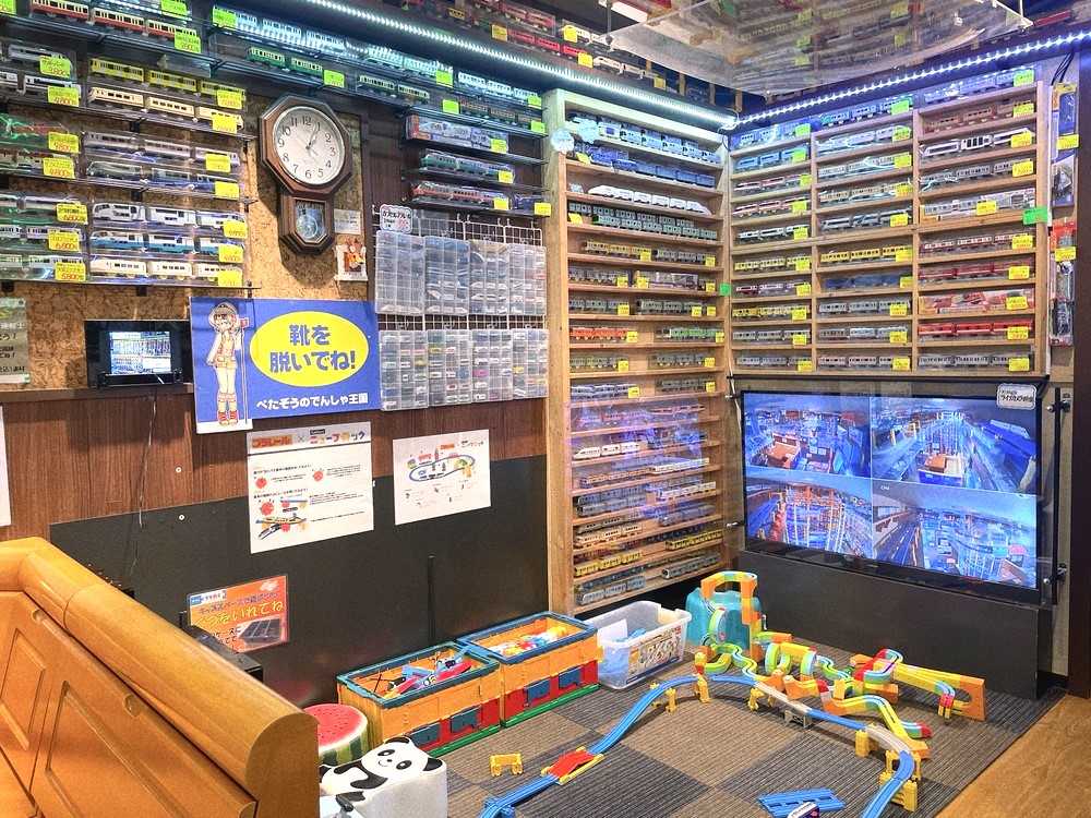 壁にはヴィンテージのプラレールが所狭しとディスプレイされています。