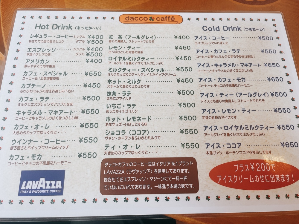 イタリアの家庭で一番売れているというLAVAZZAのコーヒーをはじめ、アイスコーヒー、紅茶のメニューが並びます。