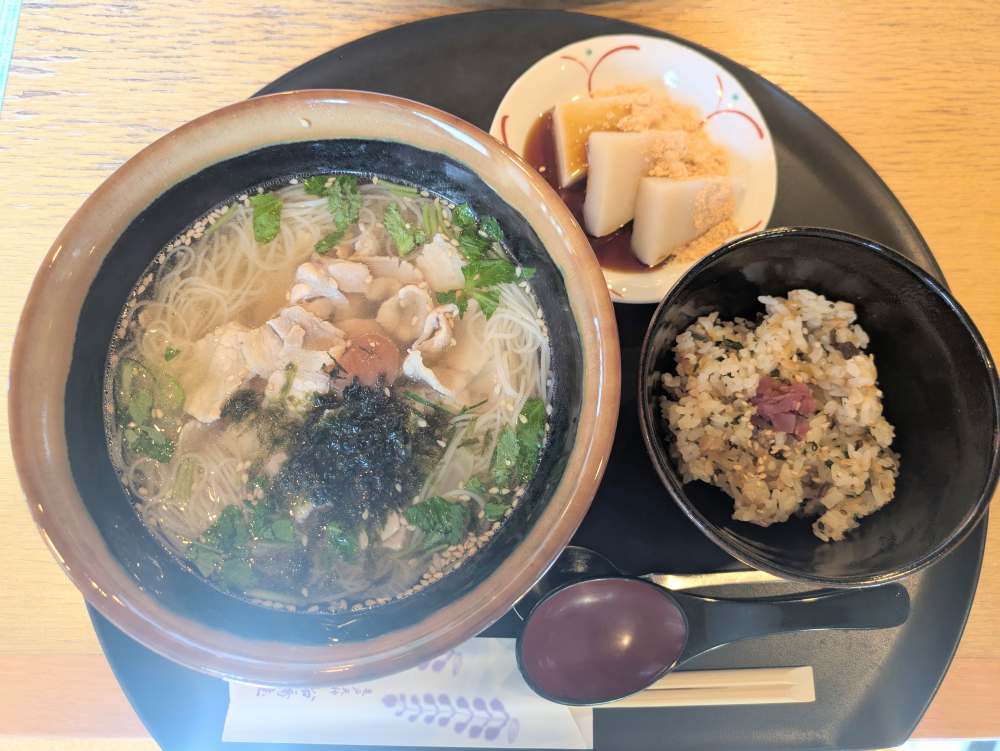名物のくず餅に加え、温かいにゅうめんとドリンクがセットになったお得なランチが楽しめます。