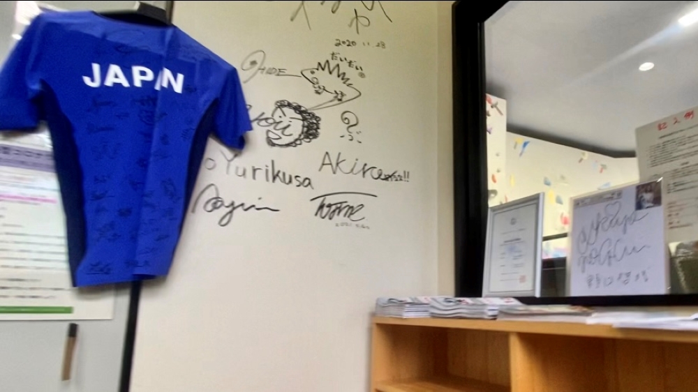施設の中に入ると、目の前の壁に、ボルダリング日本代表選手のサインが書いてありました。