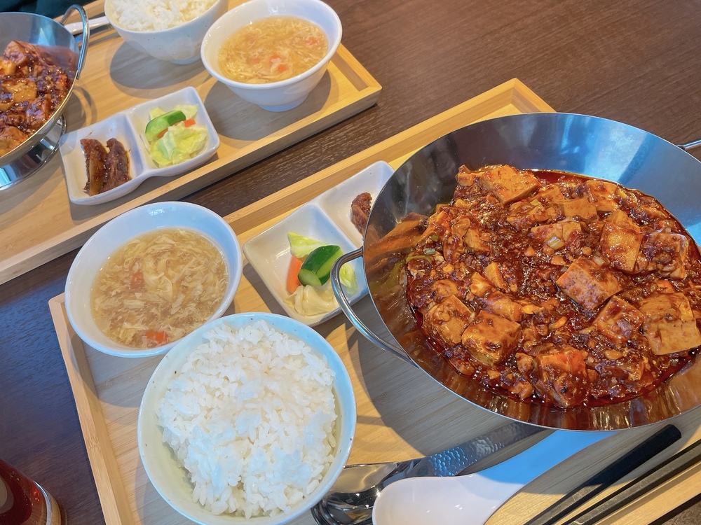 我が家は放っておくと全員同じメニューを選んでしまう悪い癖があるのですが、今回も見事、3人全員麻婆豆腐セットです。