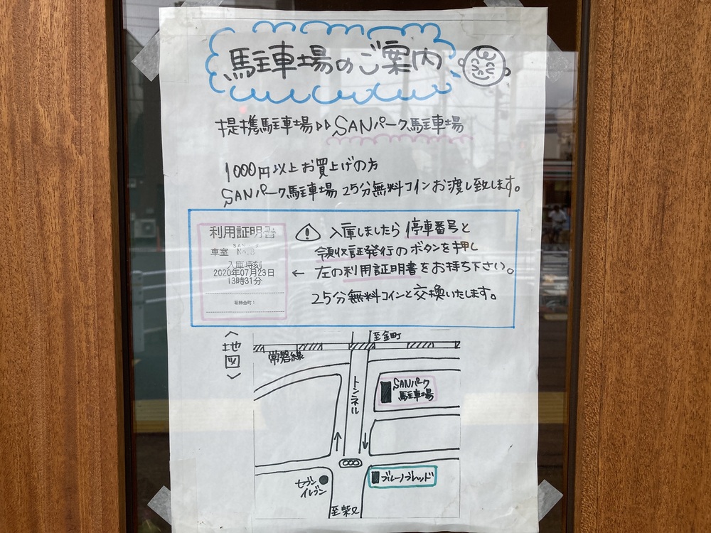 駐車場はお店からすぐの場所にある「SANパーク」を利用可能。お店の商品を1,000円以上購入すると、25分無料になるコインを貰えます。