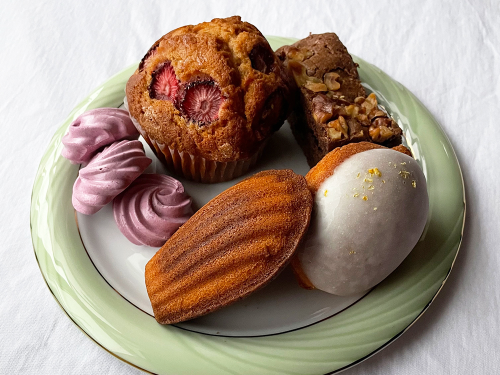 購入したのは“いちごとホワイトチョコのマフィン”、“マドレーヌ”、“レモンケーキ”、“ブラウニー”、“カシスのメレンゲ”。
