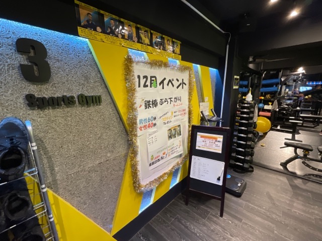 今月のイベントは「鉄棒ぶら下がりチャレンジ」男性60秒、女性40秒ぶら下がれればプロテインゲット!