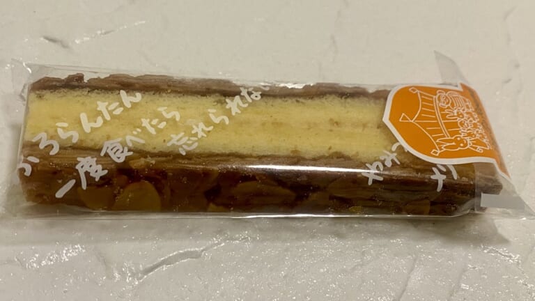 アーモンドとキャラメルでコーティングしたカステラに、バタークリームをサンドしています。
