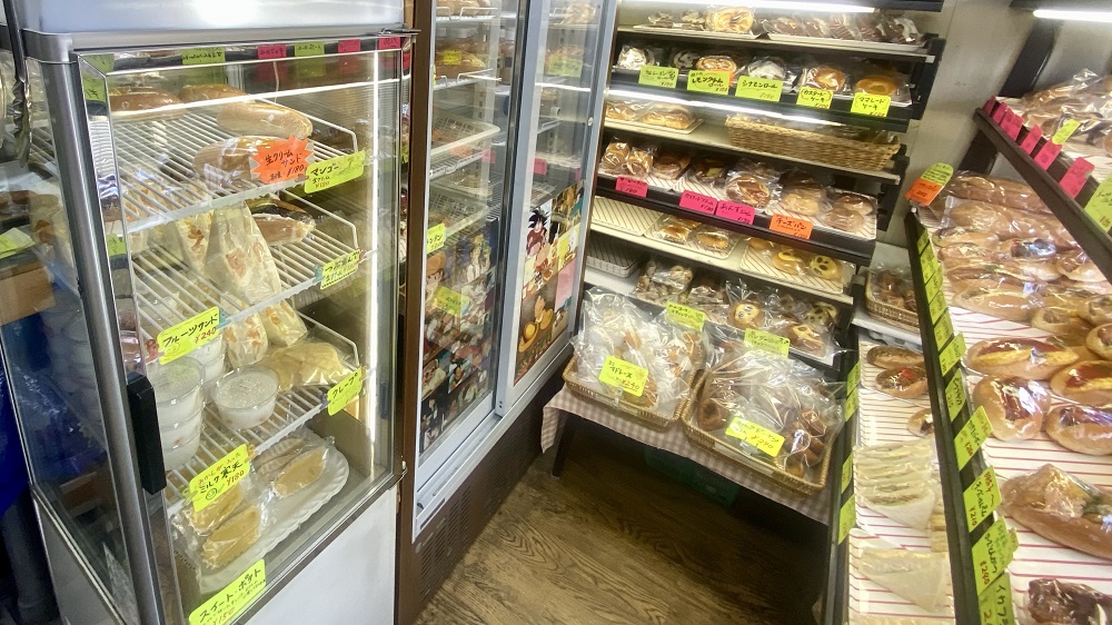 右手にはコッペパンやサンドイッチ、左手には生クリームサンドやスイートポテトなどの冷蔵のパンやスイーツが並んでいます。