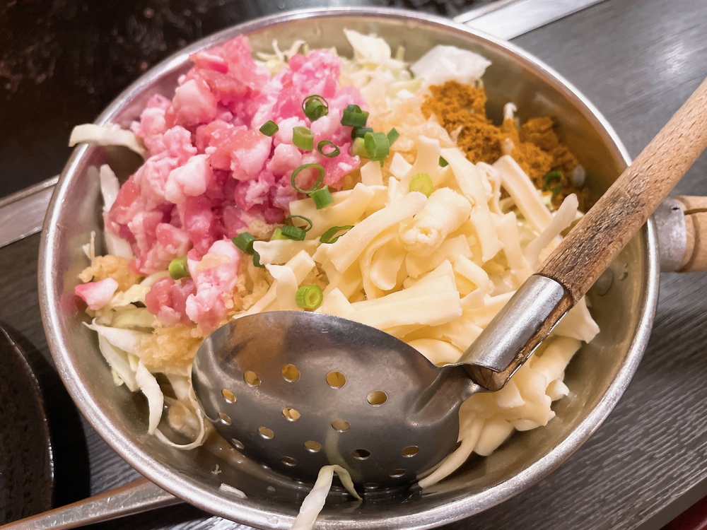 オハナのもんじゃは雪平鍋いっぱいに具が入っていて本当に良心的なんです。