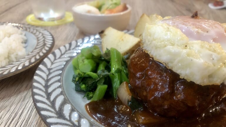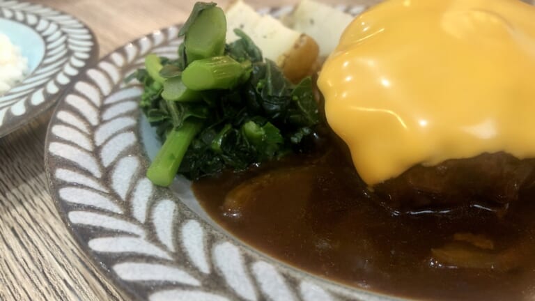 お皿のデザインとサイズ感、コロンとしたハンバーグ、文句なしでかわいいです。