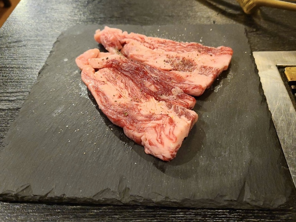 焼肉屋だと、スライスされたお肉が並んで出てくるイメージですが、こちらのお店は大きくカットされたハラミが2枚出てきました。トングで持つと重みがあります。