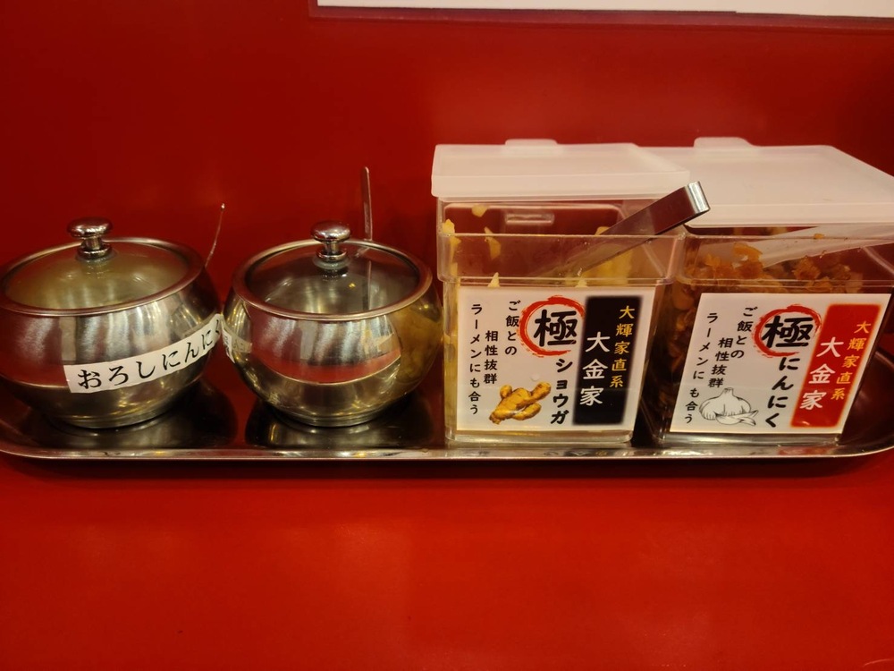 おろしにんにく、豆板醤、極ショウガ、極にんにく、写真には写っていませんが、のりたまふりかけやブラックペッパー、マヨネーズもあります。