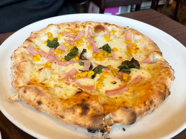 こちらはロースハム、コーン、バジリコが乗った見た目も色鮮やかな一枚。