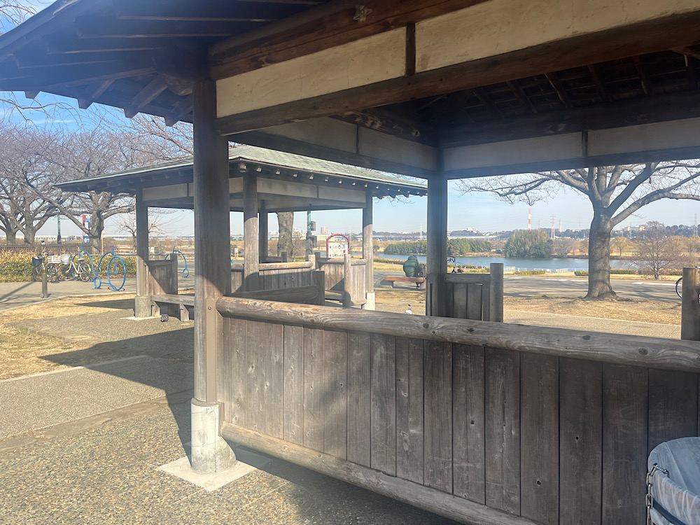 その他、公園内には自転車置き場やトイレ、健康系の遊具があります。