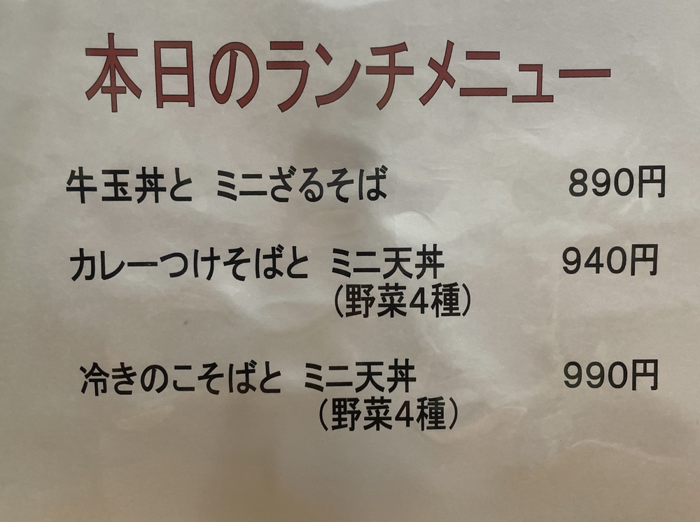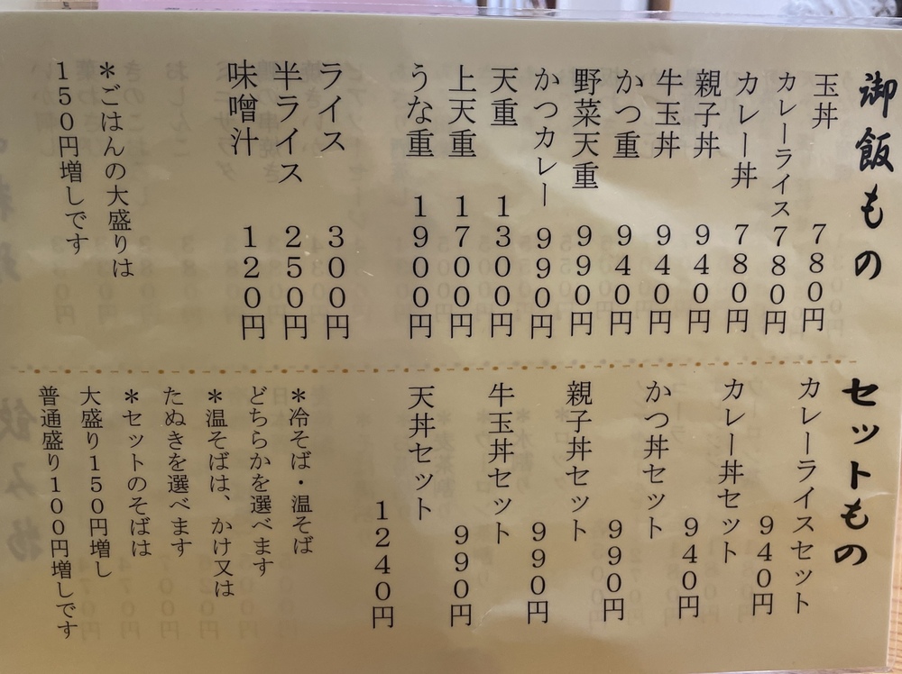 牛丼、天丼、親子丼、カレー。こちらもそば屋の定番ですね。