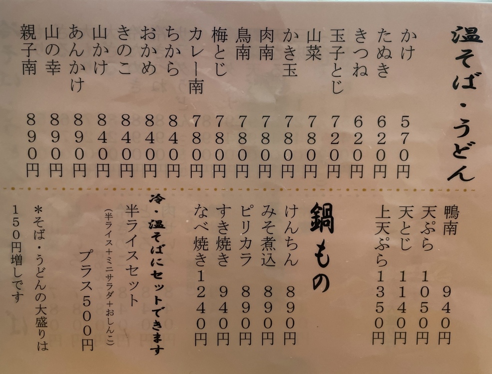 まずはそば屋の定番、温かいそば、うどんメニューが一通り並びます。