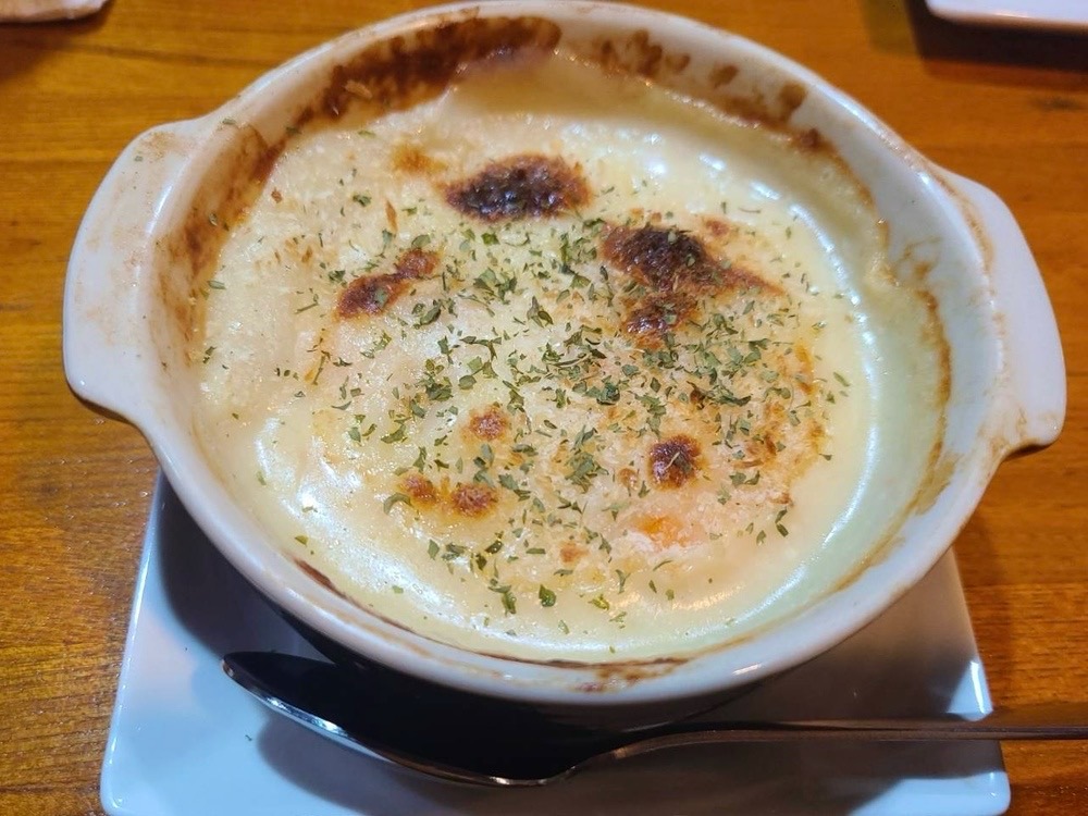 グラタンの焦げ目が食欲をそそります。あつあつでクリーミーなグラタンで、味の好みが私好みです。お酒にもよく合います。