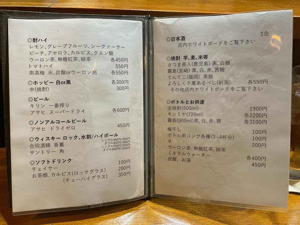 アルコールは500円台が多く、焼酎はボトルもあります。
