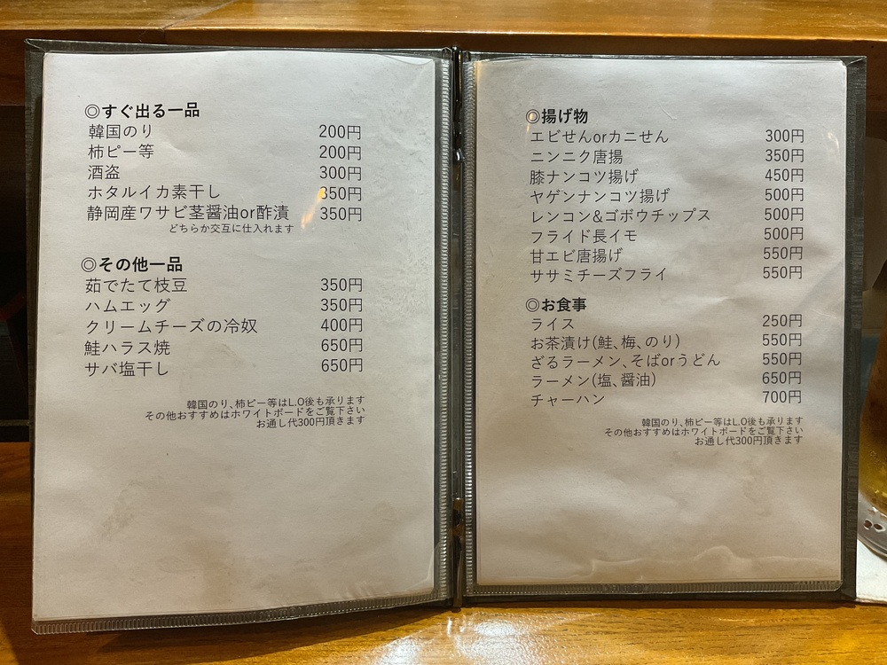 食事メニューもおつまみにうれしいものばかり。200円から600円ほどでおつまみが食べることできます。
