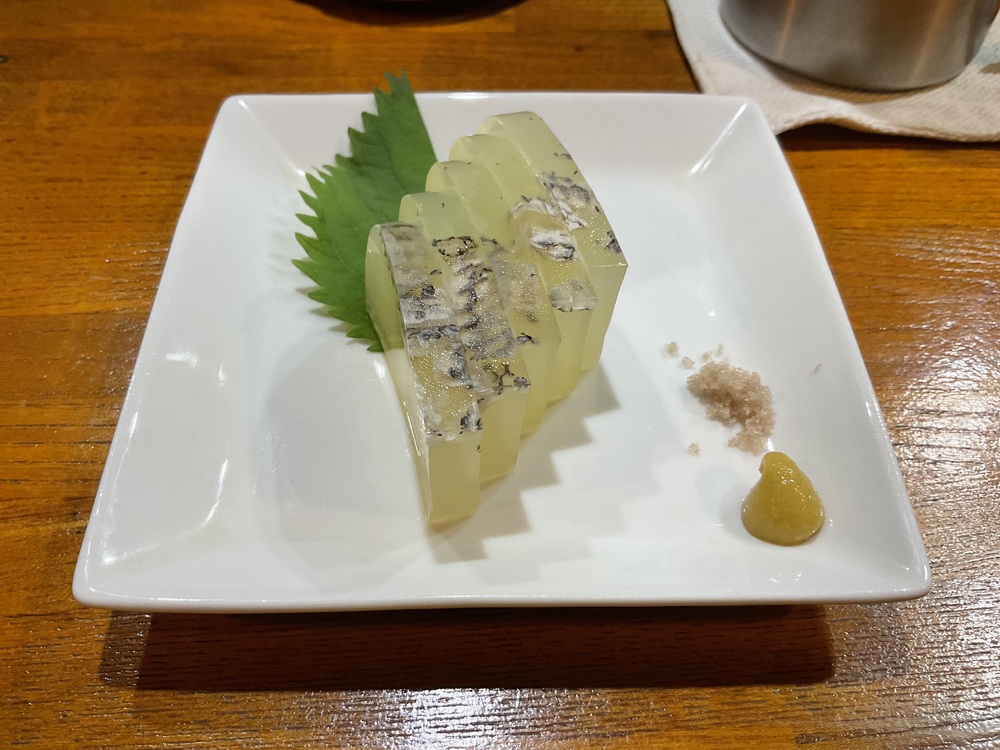 粋酔の魅力はとにかく食事がおいしいことです。まずはお通しの煮こごりで乾杯です。