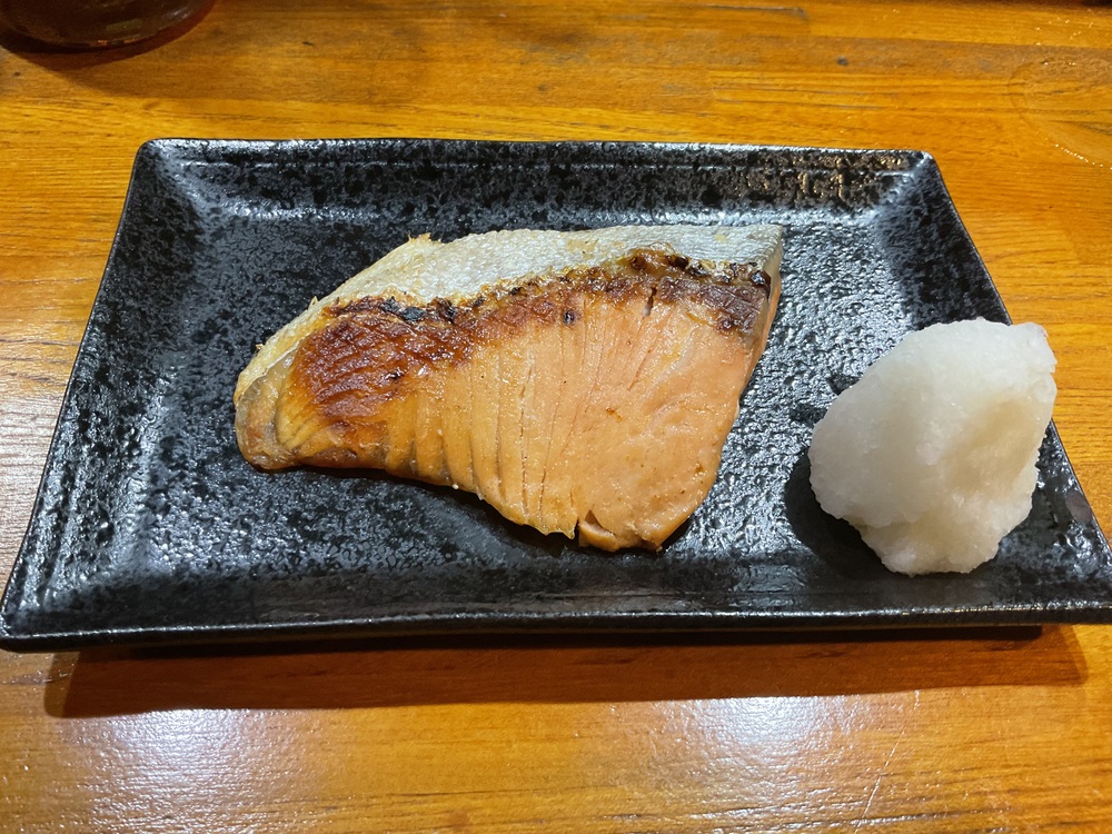 こちらは通常メニューの鮭ハラス焼です。ハラスが大きく、2人で分けても満足できる量でした。大根おろしとの相性がばつぐんです。