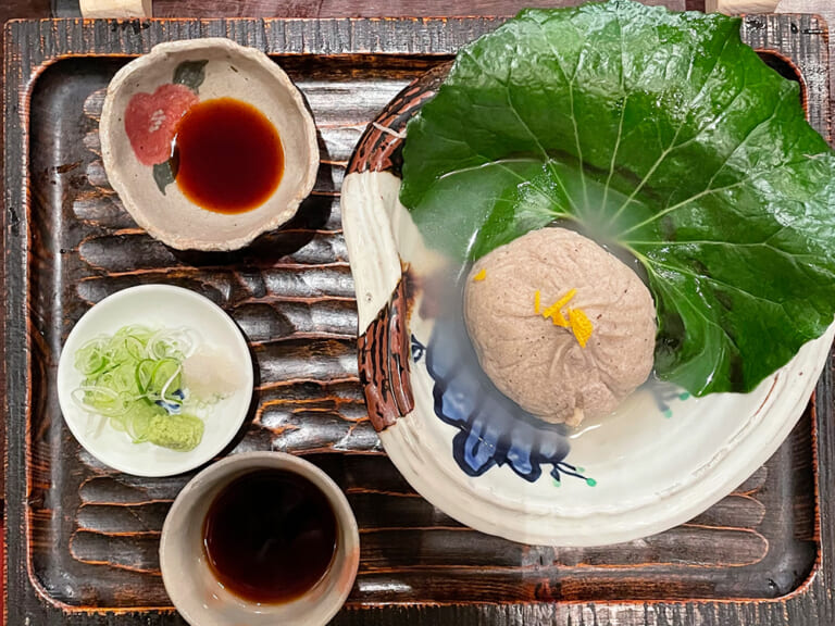 きれいなそばの葉っぱの上に、まんまるとしたそばがきが乗っています。