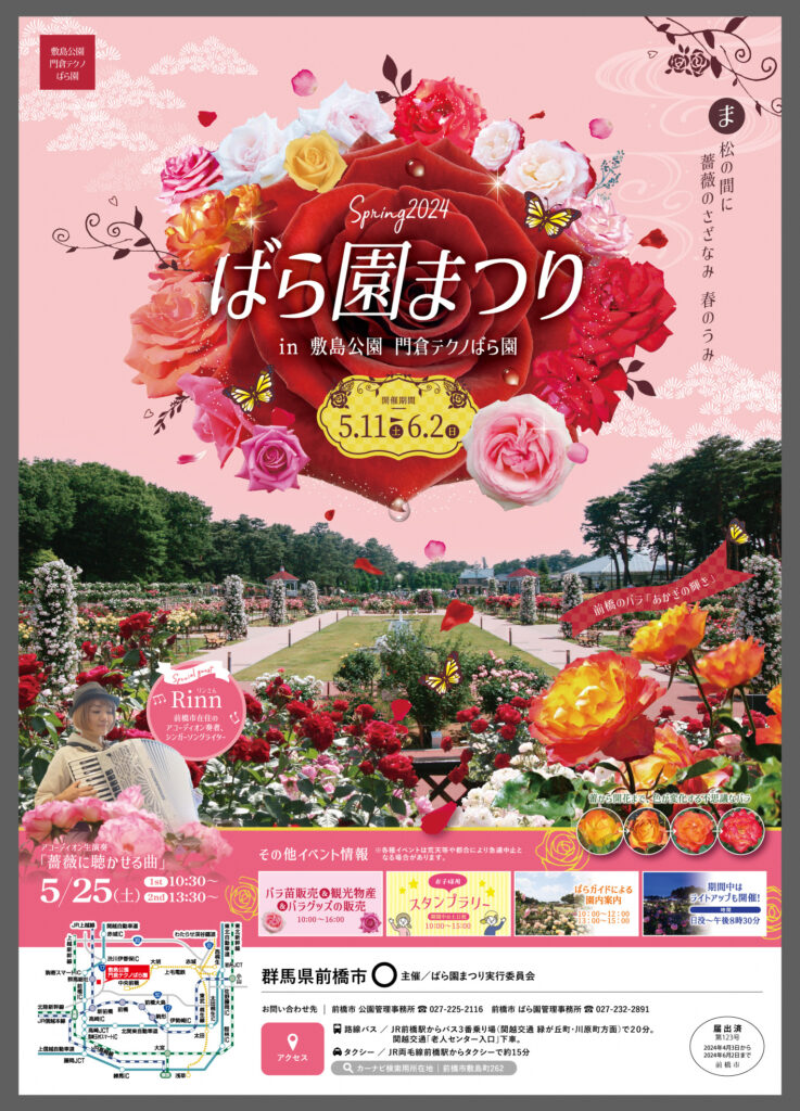 敷島公園門倉テクノばら園では、令和6年5月11日(土)から6月2日(日)までの間ばら園まつりが開催されています。