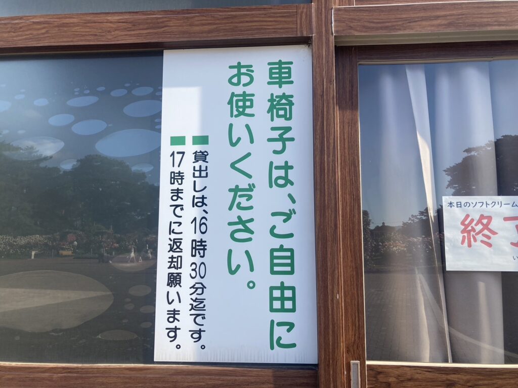 園内では車いすの貸し出しも無料で行われています。(16時半までの貸し出しです。17時までにご返却ください)